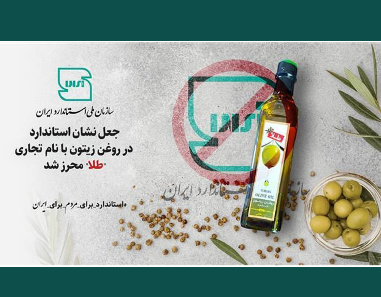 صنایع غذایی: سازمان ملی استاندارد ایران اعلام کرد: جعل نشان استاندارد در روغن زیتون با نام تجاری «طلا» محرز شد.