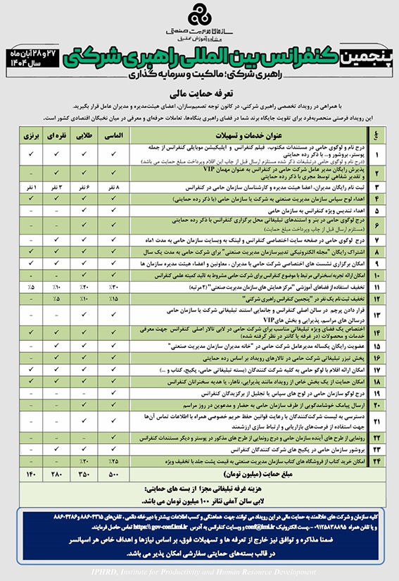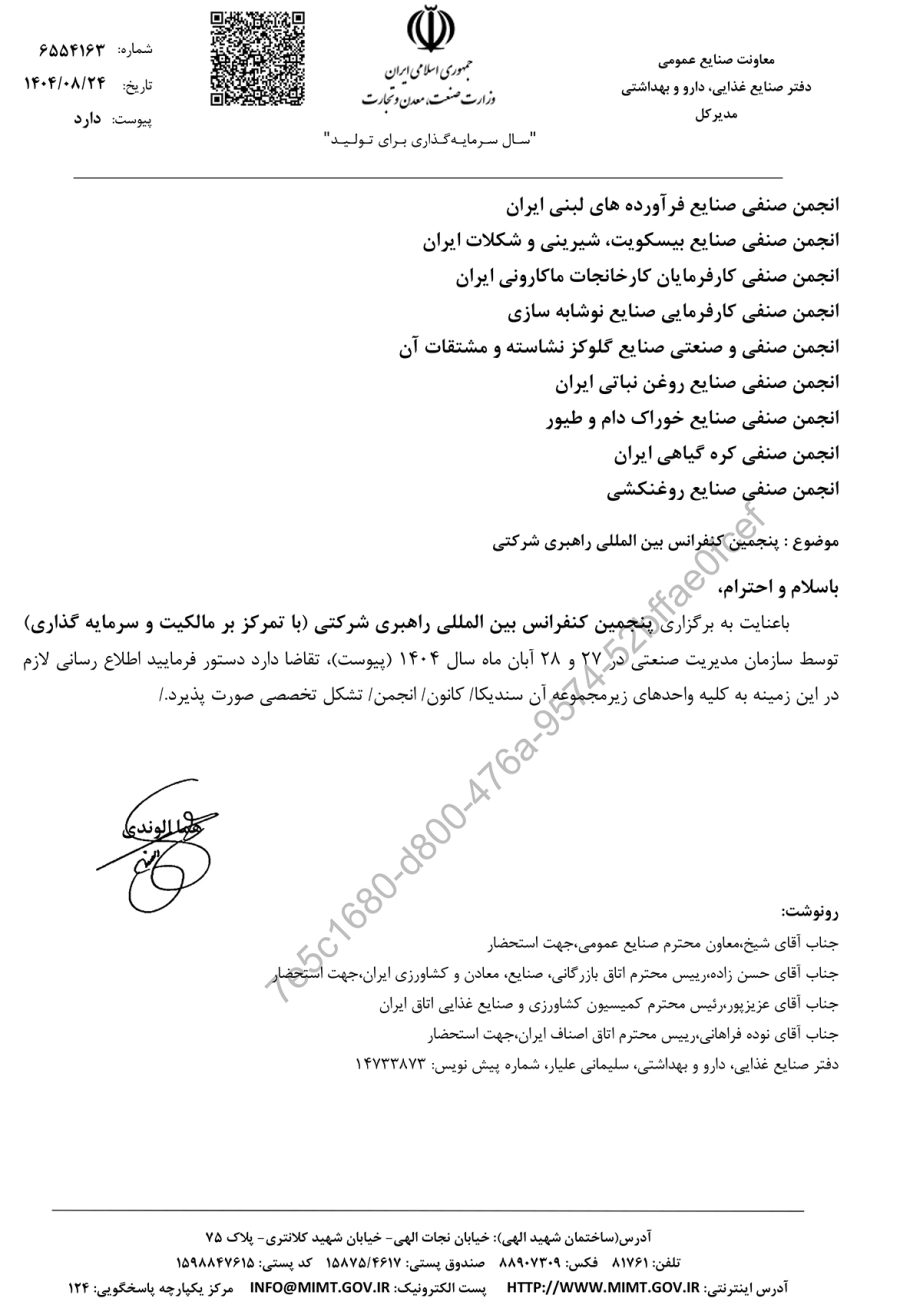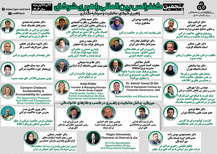 صنایع غذایی: پنجمین کنفرانس بینالمللی راهبری شرکتی ۲۷ و ۲۸ آبانماه توسط سازمان مدیریت صنعتی برگزار میشود.