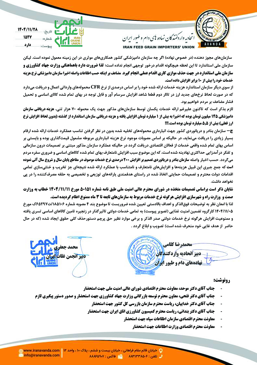به گزارش روابط عمومی انجمن غلات ایران در نامه‌ای خطاب به مهندس حسن‌زاده، رئیس اتاق ایران که به امضای محمدجعفری، دبیر انجمن غلات ایران و محمدرضا کلامی، دبیر اتحادیه واردکنندگان نهاده‌های دام و طیور ایران رسیده آمده است: